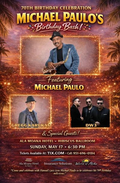 Hard to believe I am Turning 70 this year ! Last year I celebrated a milestone with the 50th anniversary concert of Kalapana at the Waikiki Shell, the band that got me my start on the world stage. Since then I have been fortunate to perform on six continents for millions of people . Since my humble beginnings at the St Louis High School band room I have been fortunate to have had a wonderful career playing music because of all of you. What better way to celebrate then with a music concert with my friends. Pianist Gregg Karukas https://www.karukas.com/ is also turning 70 with me this year in May . He will be joining me along with the most popular vocal group in smooth jazz DW3. https://www.dw3music.net/ . They will make this a fun celebration. I will also have some surprise guests appearing with me including a guitarist I have toured with for over 20 years. It’s been 18 years since I started bringing smooth jazz to Hawaii and have produced over 70 concerts in Hawaii. I couldn't have done it without your support. I hope you will join us and celebrate this milestone with me on